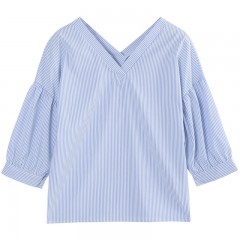 韩都衣舍2017韩版女装春装新款条纹显瘦百搭宽松v领七分袖衬衫潮 领券立减/单件包邮/七天无理由退换